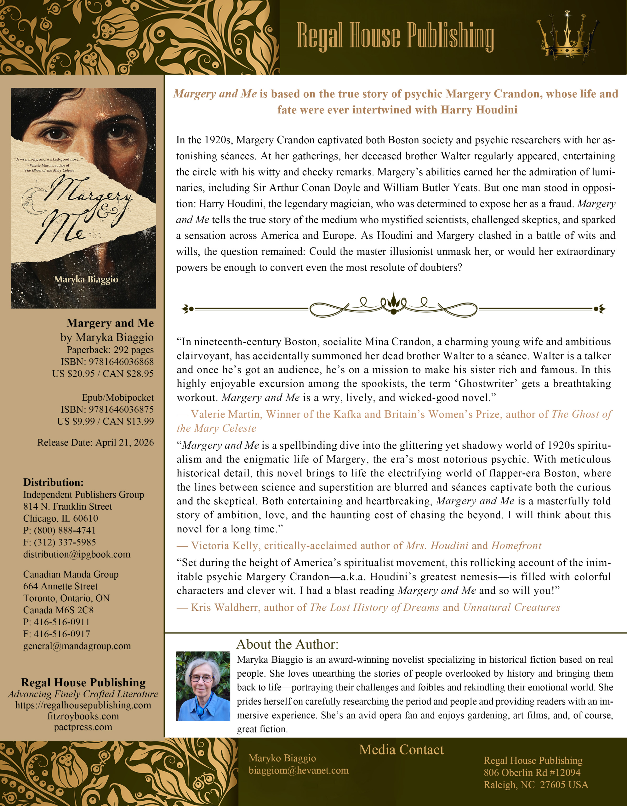 "Margery and Me is based on the true story of an American psychic who drew both the admiration of Sir Arthur Conan Doyle and the skepticism of Harry Houdini. True to the parlors of both the modest and the great in which Margery performed her feats, Biaggio’s novel is a fast-paced, historically rich account of the spiritualist’s struggles to have her psychic powers accepted and celebrated. Narrated by her dead brother Walter, a gleeful storyteller who performs stunts as entertaining as his voice, the novel depicts the many experiments Margery endures at the hands of the powerful men associated with the journal Scientific American. A spiritualist narrative about a pre-feminist society that harshly scrutinized strong women, Margery and Me is a delightful story about the power of vision and purpose, especially when that purpose is greater than oneself.”